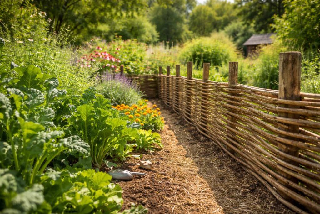 A woven twig fence is a natural and decorative way to create a border around your garden. It adds a rustic look and blends well with plants, making the garden feel more organic.