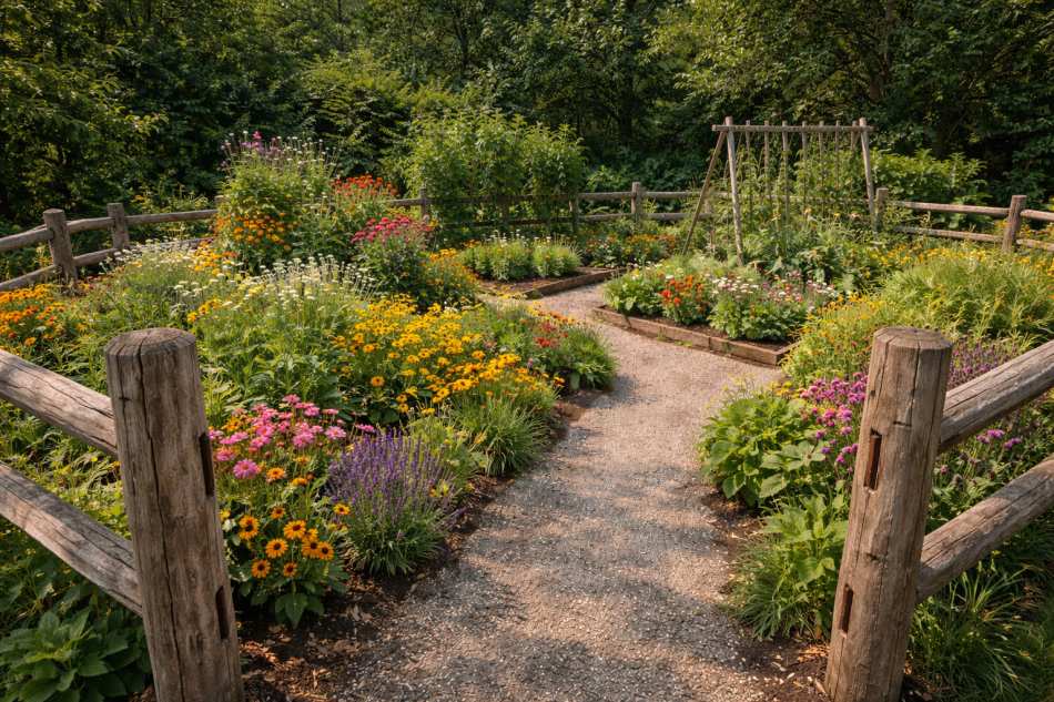 A split rail fence gives the garden a simple countryside look while still creating a clear boundary around the space. It is useful for marking garden areas and guiding foot traffic so people don’t step on plants.