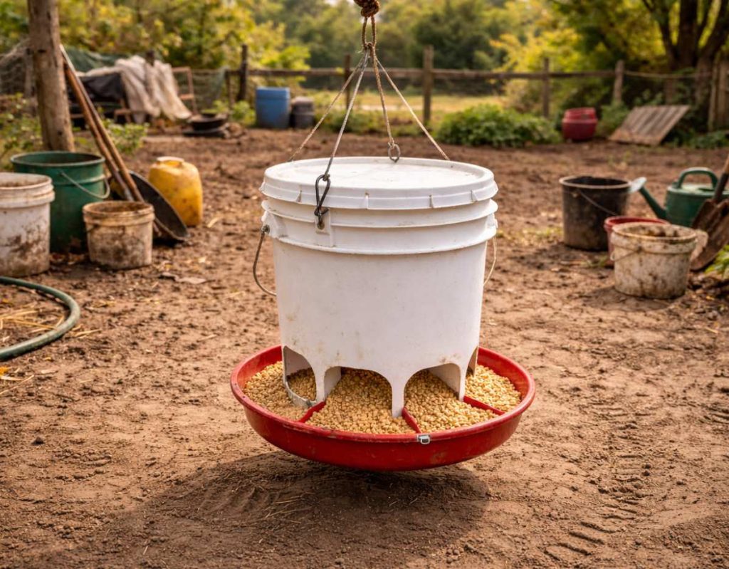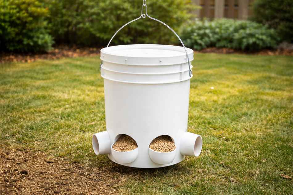 A 5-gallon bucket feeder is perfect if you want something simple with good capacity. Place it under a covered area in the coop or run, slightly raised to back height to reduce spillage. A standard bucket can easily hold enough feed for several days for a small flock.
