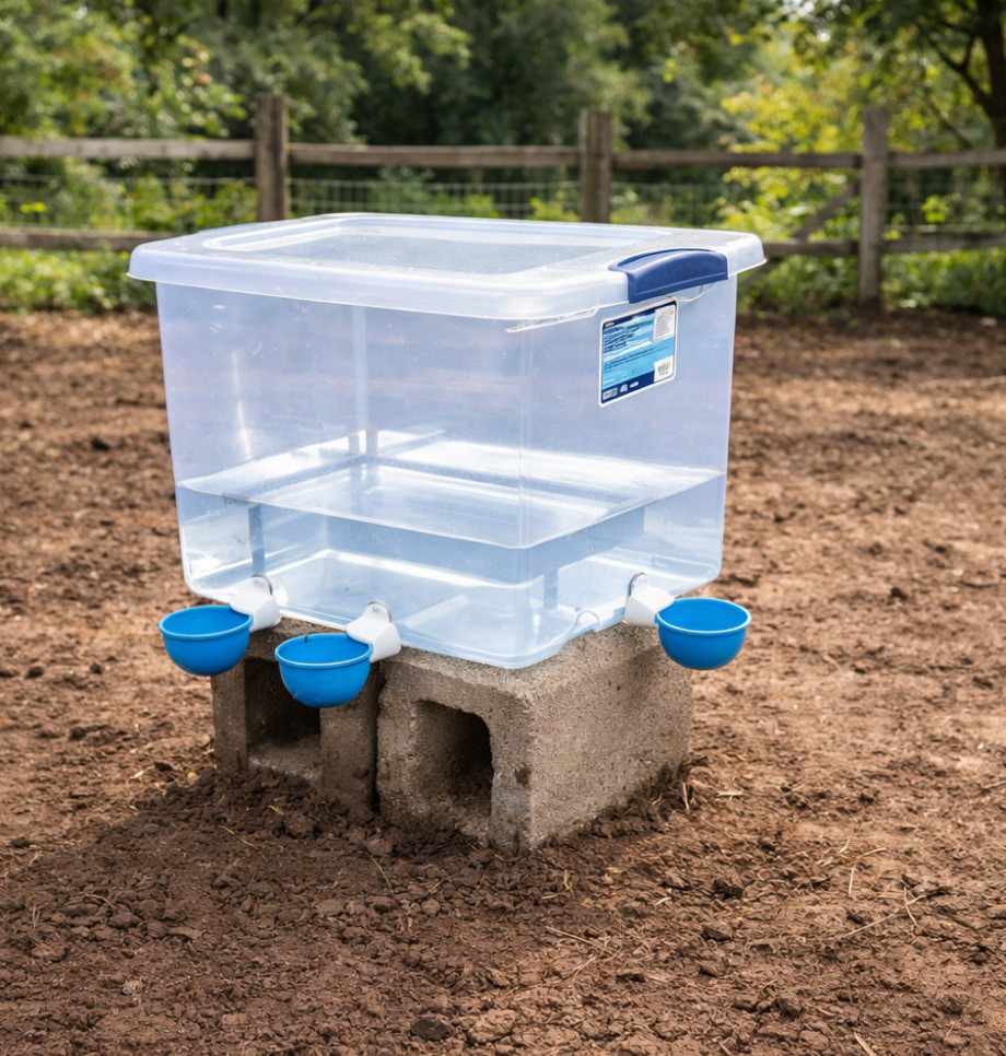 Make it large enough to hold a full day’s feed so all your chickens can eat without crowding. The lid helps protect the feed from rain and dirt.
