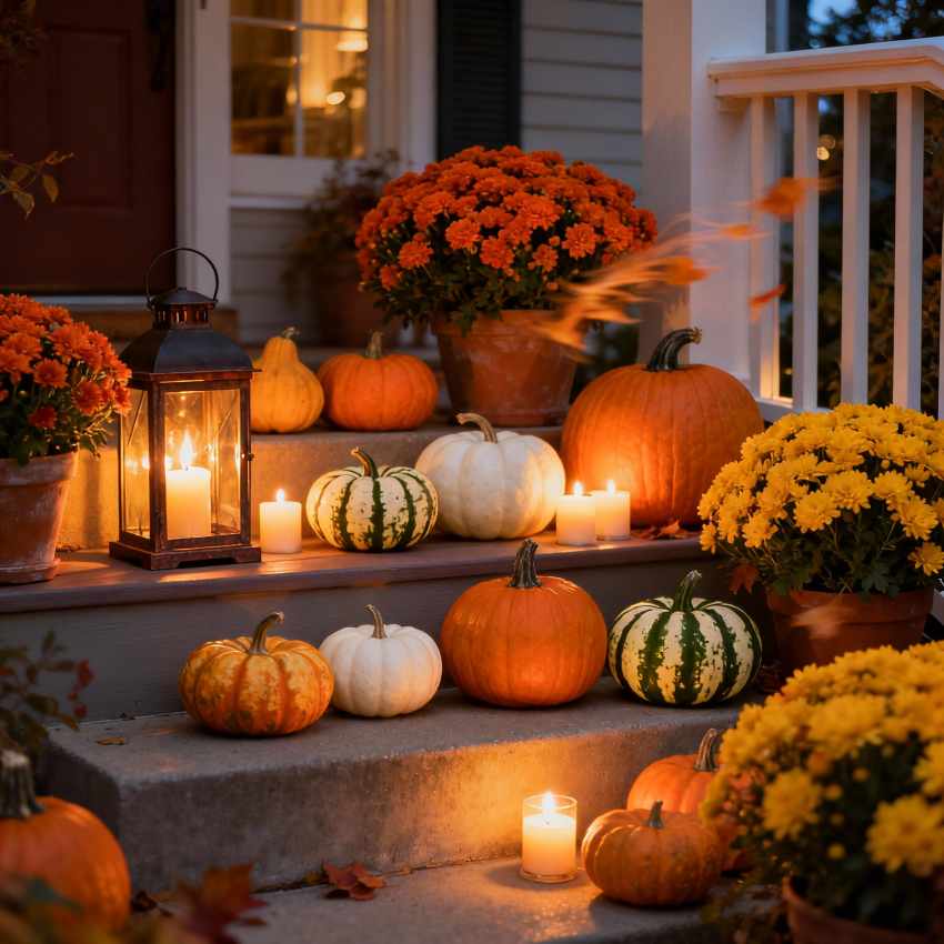 To complete the setup, consider tucking in lanterns or small pots of mums between pumpkins. As evening falls, the glow of candles adds warmth and makes your porch inviting.