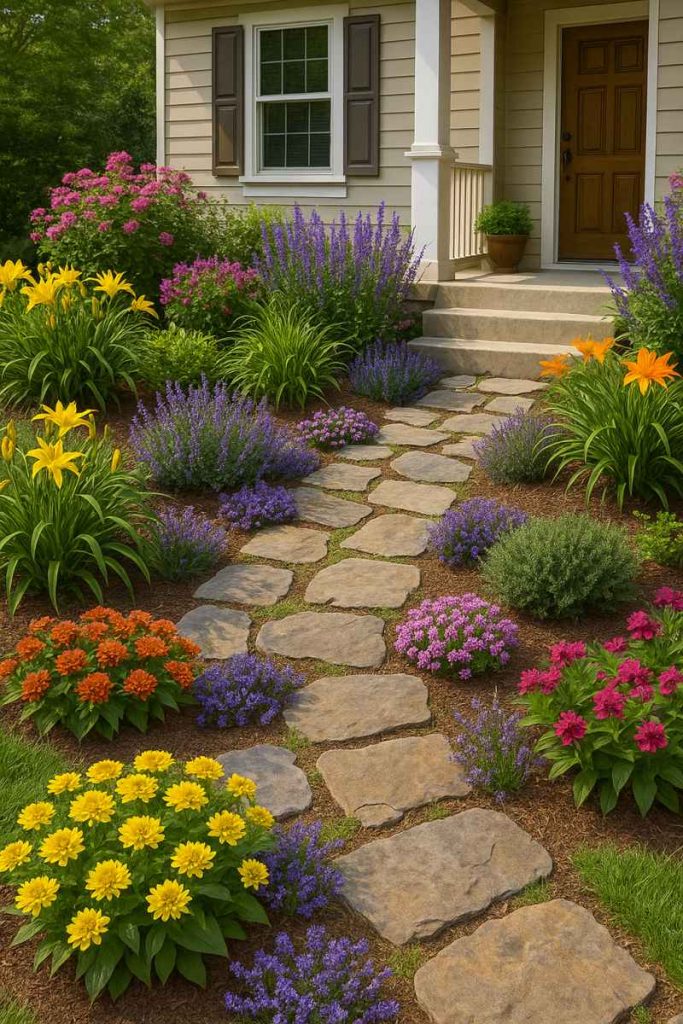 To elevate the look, border the flagstone path with larger perennials like daylilies or salvia. This creates a layered effect that makes the walkway stand out as a focal point.