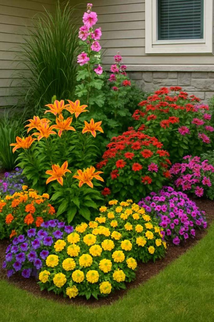 Using different sizes also adds depth, making small yards appear larger. Taller plants create a natural backdrop, while cascading flowers like trailing petunias soften the edges. The contrast in heights makes the beds look dynamic rather than flat.