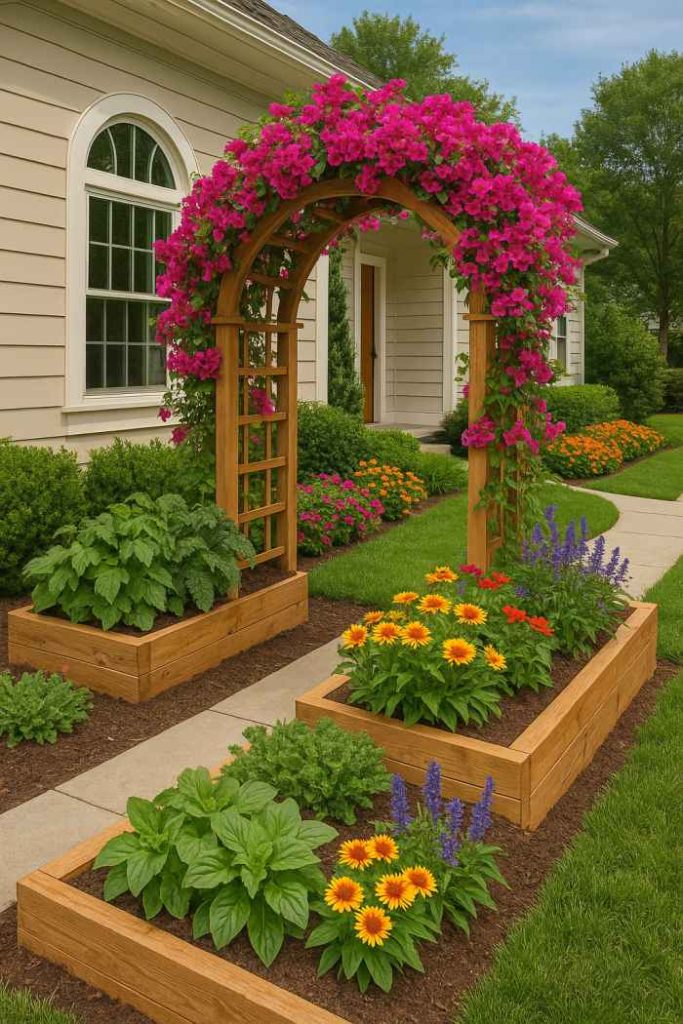 To soften the look, add smaller flower beds at the trellis base. This way, you get both vertical and horizontal beauty in one design.