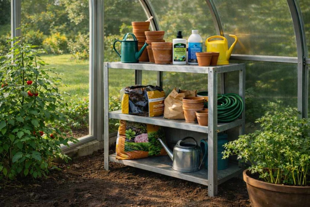 A small storage shelf can make a big difference in your greenhouse. It gives you a proper place to keep soil bags, extra pots, watering cans, and fertilizers. When everything has a place, the space feels less cluttered.