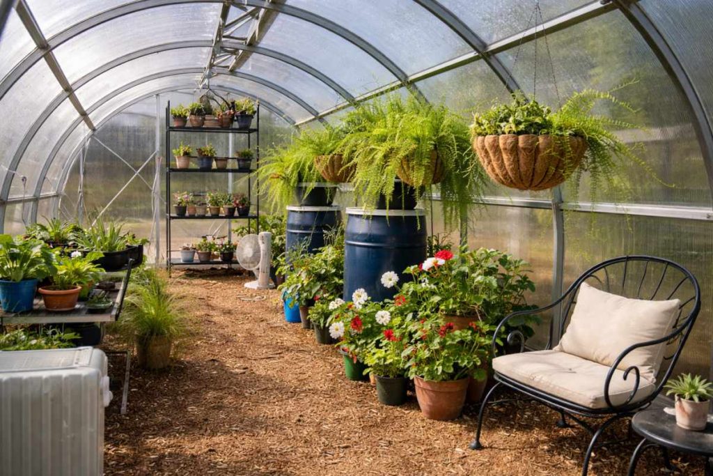 When you set it up this way, your greenhouse feels more relaxed and welcoming — not just a place to grow plants, but a place to enjoy them too.