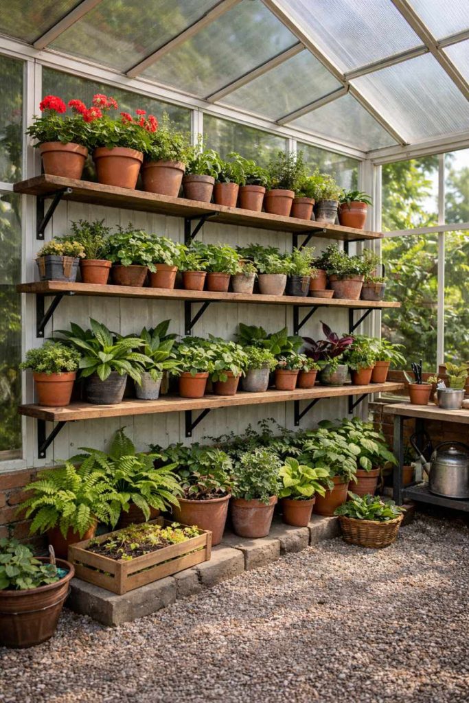 One of the smartest ways to design your greenhouse interior is by using layered shelving. Instead of placing all pots on the ground, install shelves at different heights along the walls. This allows every plant to receive better light exposure, especially in smaller greenhouses.