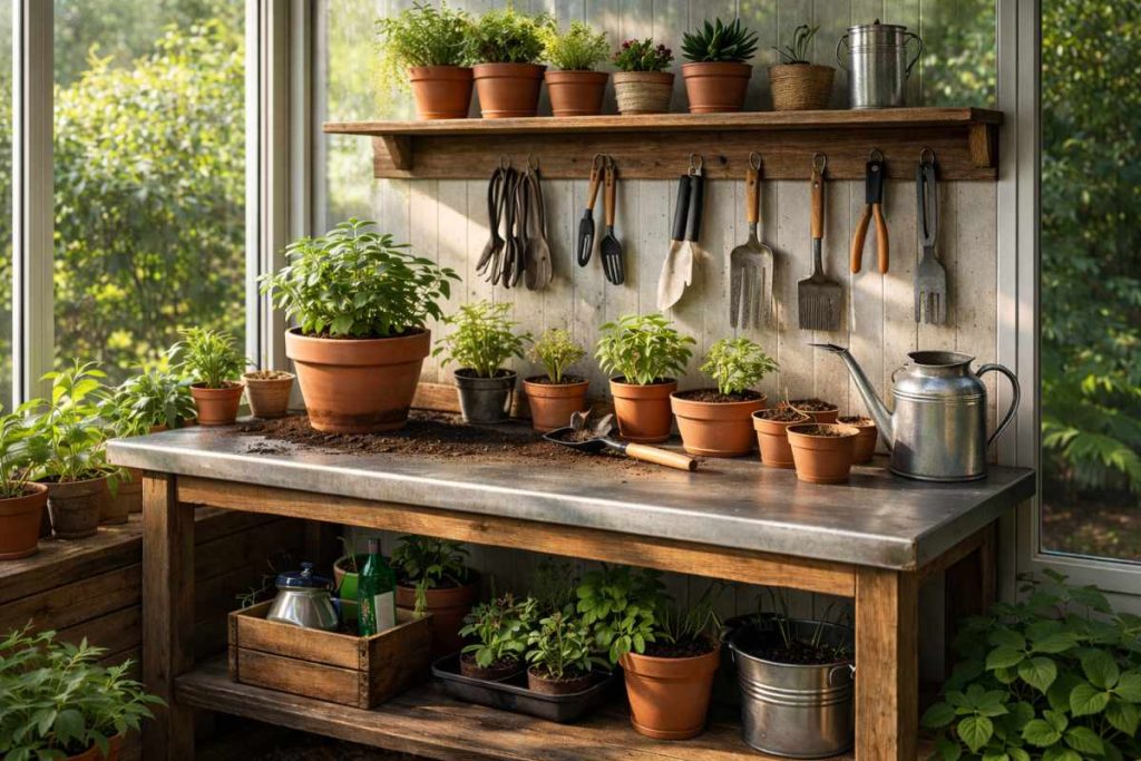 Choose a sturdy table or wooden bench that can handle water and soil. You can add small hooks or shelves above it to hang tools like pruners and gloves. This saves time because everything stays within reach.