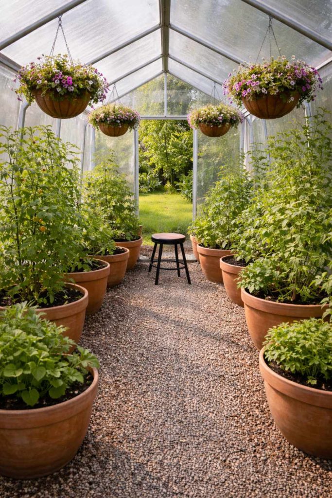When you vary pot heights and shapes, the space feels more interesting and relaxed. It gives your greenhouse that “collected over time” look rather than something overly planned.