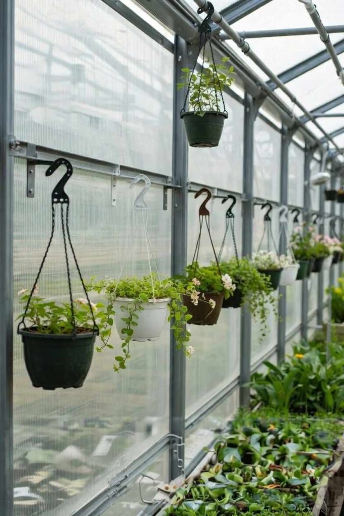 Hanging baskets are a simple way to use the upper space in your greenhouse. Instead of crowding the floor with more pots, you can hang lightweight planters from the roof frame or support bars. This instantly creates more room below.