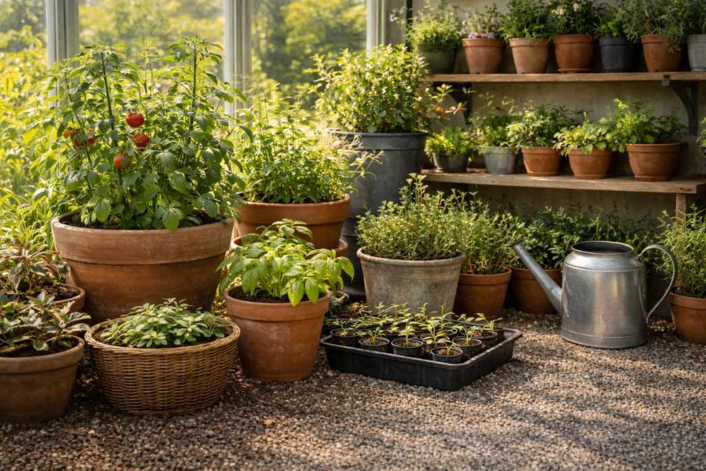 Using pots of different sizes makes your greenhouse look less stiff and more natural. Instead of lining up identical containers, try mixing tall pots, medium ones, and a few small trays for seedlings.