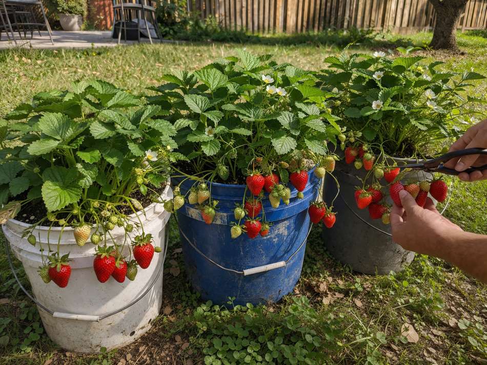 Strawberries in buckets need regular watering because the soil dries out quickly. Keep the soil moist, but not too wet.