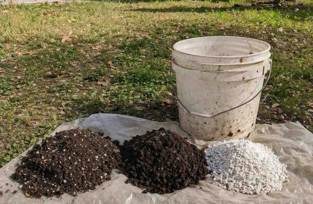 Start with a good-quality potting mix as your base. Avoid using regular garden soil—it’s usually too heavy and can compact inside the bucket, which leads to poor root growth and waterlogging.