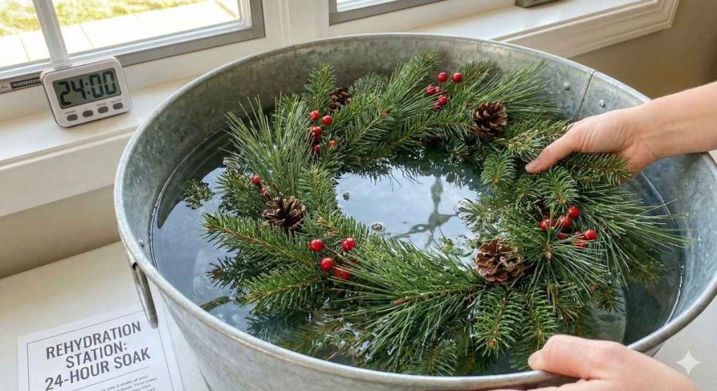 If soaking the whole wreath isn’t possible, at least soak the cut ends thoroughly. This allows the branches to drink up water and significantly slows needle drying and browning.