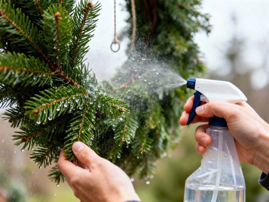 Spray the entire wreath generously right after the soak, making sure to cover needles, stems, and cut ends. This creates a barrier against dry heat and winter wind, slowing moisture loss dramatically.