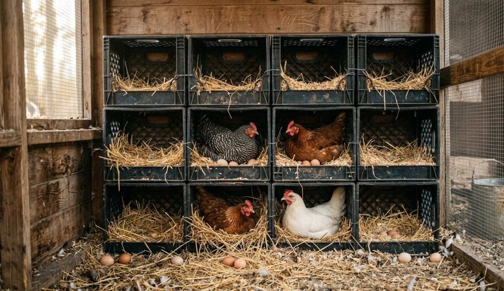 Instead of building complicated wooden nest boxes, many chicken keepers rely on milk crates. They’re strong, uniform, and incredibly easy to clean or replace.