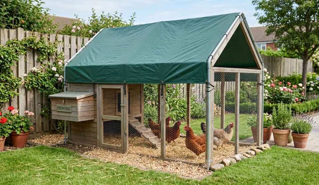 Need something quick, affordable, and functional? A tarp-covered coop might be the fastest way to get birds under shelter. Build a simple wooden cube or rectangle, secure wire on the sides, then stretch a heavy-duty tarp across the top and part of the walls.