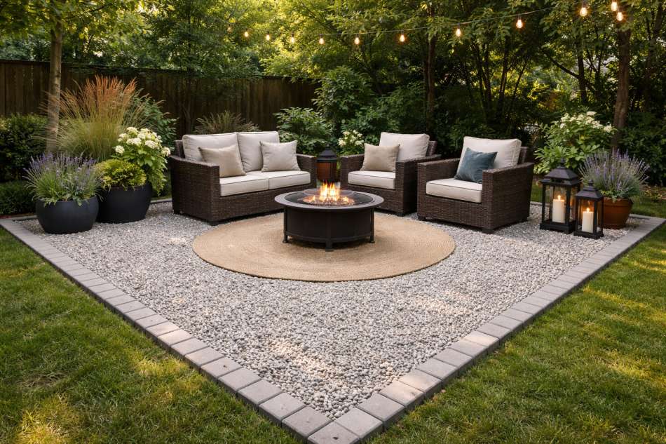This patio idea helps make a basic gravel space look more neat and organized. Adding a border gives the patio a clear shape and keeps the materials from spreading out.