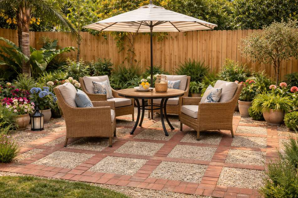 This type of patio combines bricks and gravel to create a balanced and low-cost design. It looks more interesting than using just one material and still stays within budget.