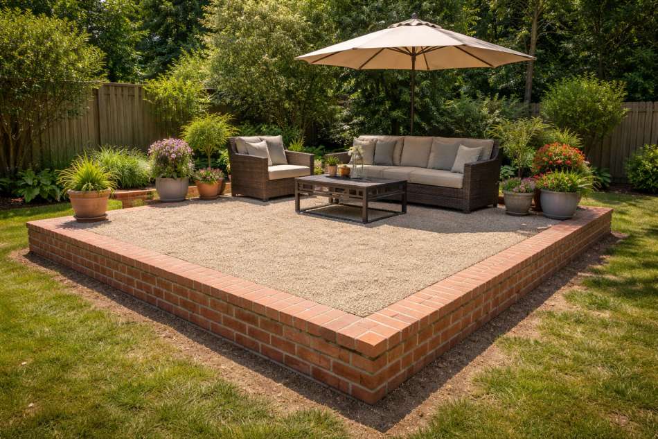 Build a low border using bricks to outline the patio, then fill the inside with gravel or sand. Level the surface properly and press it down to make it firm. This creates a clean and slightly elevated patio space.