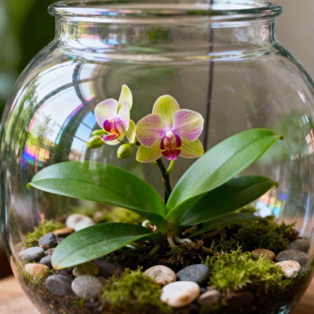 A sealed terrarium traps moisture, creating the perfect environment for humidity-loving orchids. This low-maintenance setup almost waters itself.