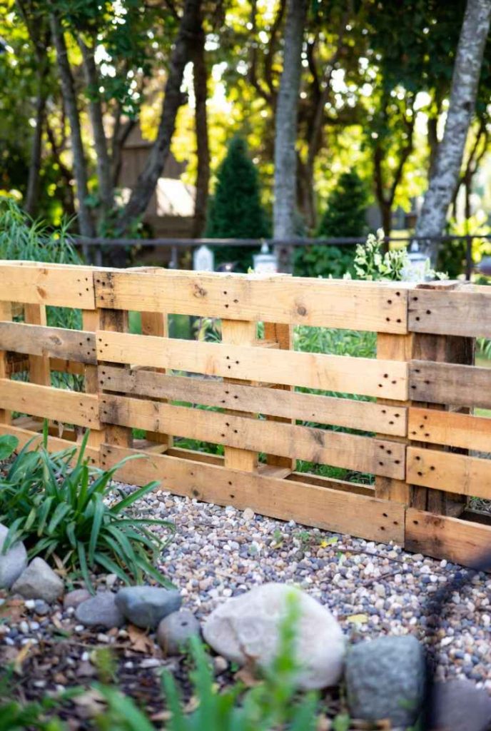 Not every garden needs a tall barrier. This option uses cut-down pallets to create a low fence that defines space rather than closing it off. It’s especially useful around raised beds or vegetable patches.