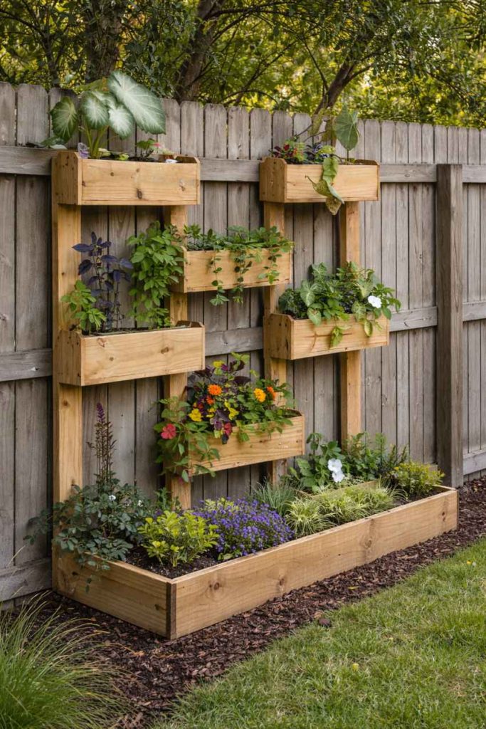 This type of fence is perfect for herbs, strawberries, succulents, or trailing flowers. The plants soften the rough wood and make the fence feel alive rather than purely functional. It also keeps frequently used herbs within arm’s reach.