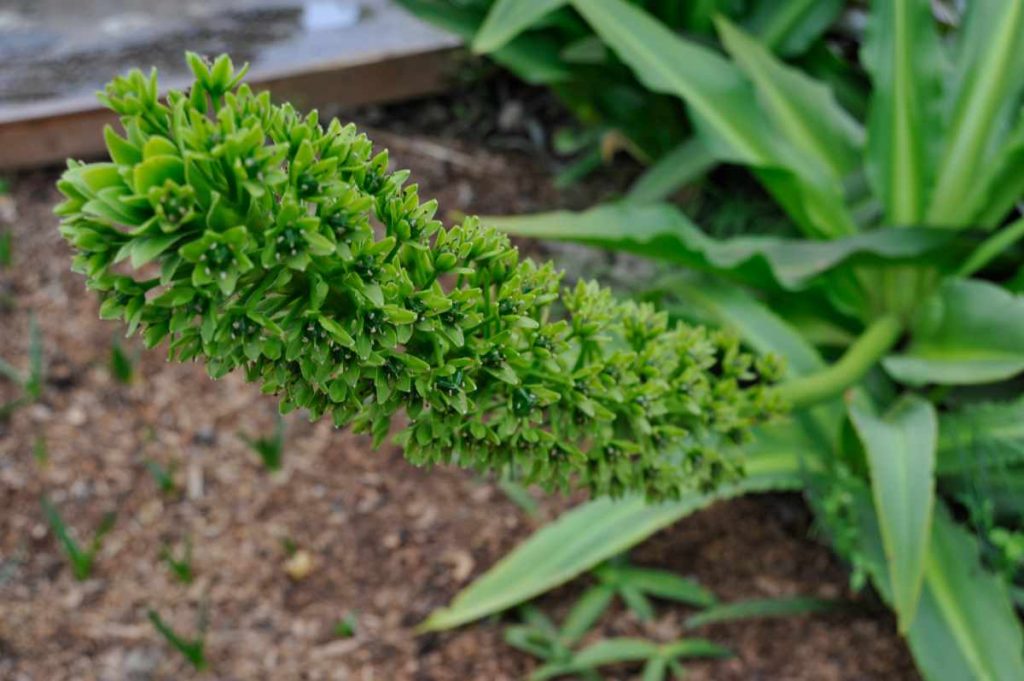 The leaves come up first and grow in a neat clump. Then a thick stem forms with many tiny flowers on top. Some people call it pineapple lily because of the shape.