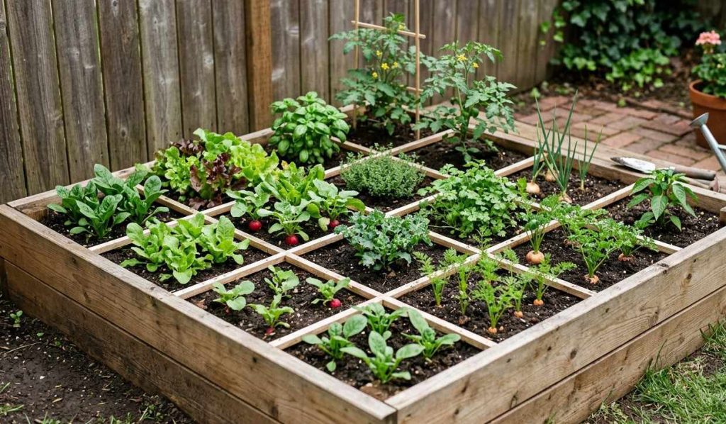 Then plant different vegetables in each section based on their spacing needs. This way, you avoid wasting space and can grow a variety of crops in one compact area.