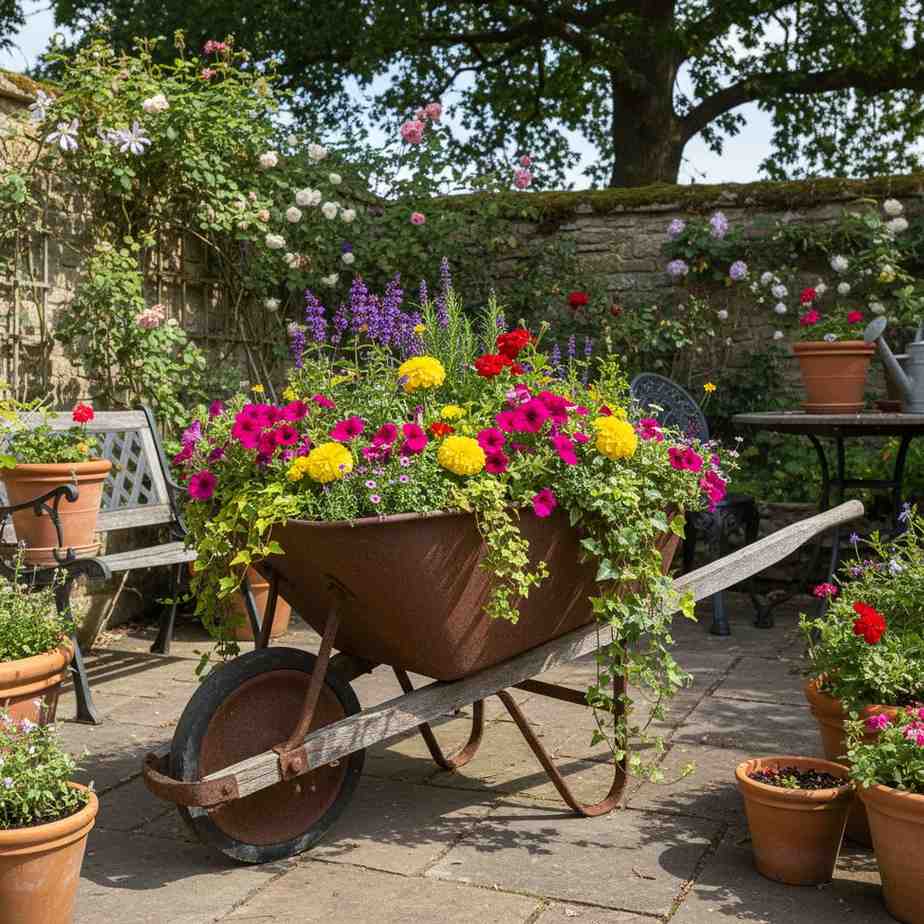 Vintage wheelbarrows add character without costing anything if you already have one lying around. They’re deep enough for bigger root systems and hold up well outdoors. Paint it bright colors or leave it rusty depending on your style.